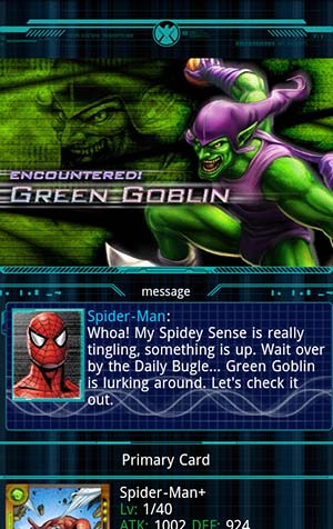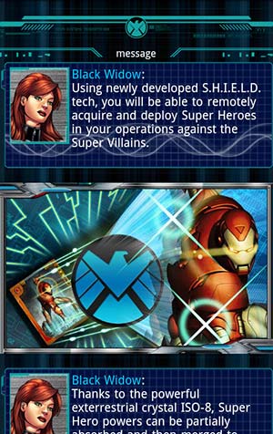 ゲームを始めると,「ブラック・ウィドウ」がゲームの大まかな流れを解説してくれるチュートリアルが始まるので,内容を確認しながらタップ操作で進めていけばいい。ゲームの流れは,一般的なカードバトル系のソーシャルゲームと大きく変わることはないので,そういったタイプのゲームをプレイしたことがある人ならまず問題なくなじめそうだ。